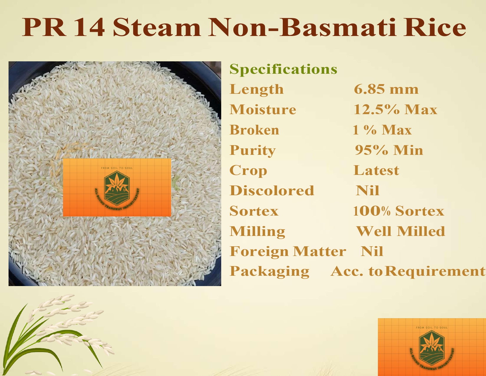 PR 14 Steam Non-Basmati Rice is a high-quality, long-grain variety known for its excellent texture, neutral aroma, and versatile cooking applications. With a grain length of 6.85 mm, 95% minimum purity, and 100% Sortex processing, this rice offers consistency and reliability. The well-milled grains, low moisture content (12.5% max), and minimal breakage (1% max) make it an ideal choice for bulk buyers and food industries.