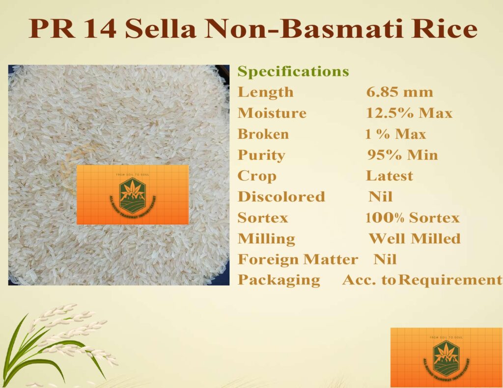 PR 14 Sella Non-Basmati Rice is a premium, long-grain variety known for its uniformity, soft texture, and excellent cooking properties. With a grain length of 6.85 mm, 95% minimum purity, and 100% Sortex processing, this rice ensures high quality and consistency. The well-milled grains, low moisture content (12.5% max), and minimal breakage (1% max) make it a preferred choice for wholesalers, retailers, and bulk buyers.
