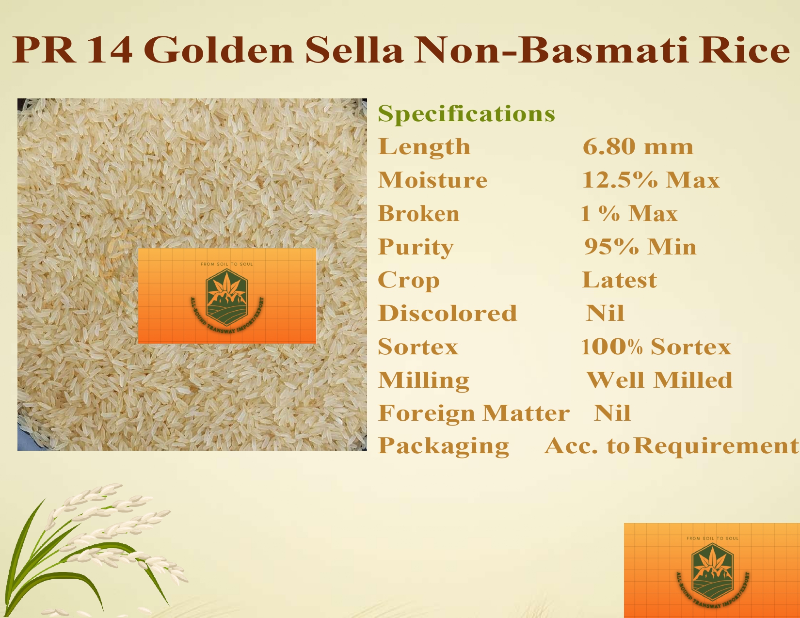 Ideal for various culinary applications, PR 14 Golden Sella Non-Basmati Rice is available in customizable packaging. Contact us today for top-quality rice at the best prices!