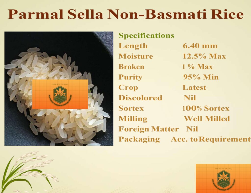Parmal Sella Non-Basmati Rice is a high-quality long-grain variety known for its excellent texture and cooking properties. With a grain length of 6.40 mm, 95% minimum purity, and 100% Sortex cleaning, it ensures uniformity and consistency. The well-milled grains, low moisture content (12.5% max), and minimal breakage (1% max) make it a preferred choice for wholesalers, retailers, and bulk buyers.