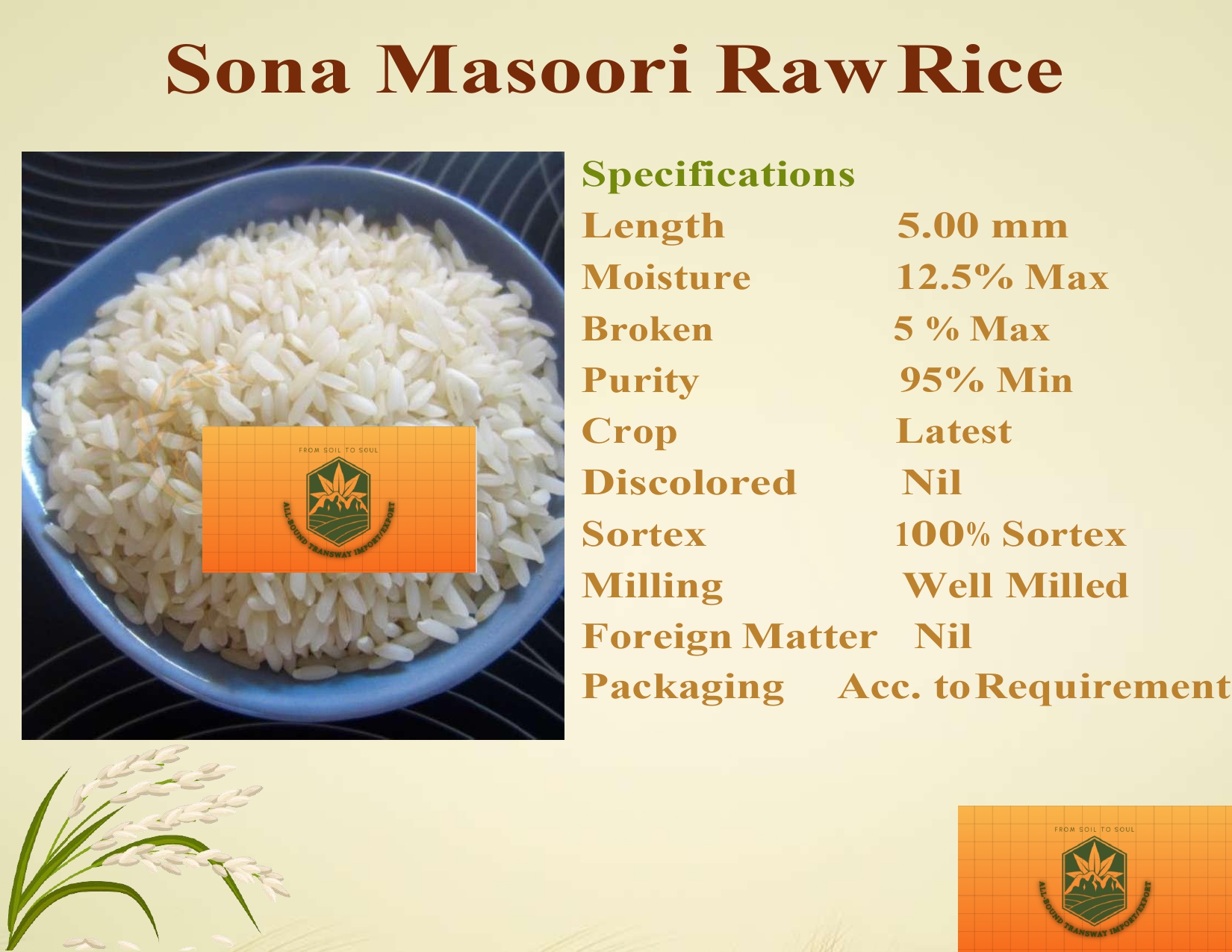 Sona Masoori Raw Rice is a high-quality, lightweight, and aromatic rice variety known for its excellent texture and cooking properties. With a grain length of 5.00 mm, 95% minimum purity, and 100% Sortex cleaning, it ensures uniformity and consistency. The well-milled grains, low moisture content (12.5% max), and minimal breakage (5% max) make it a preferred choice for wholesalers, retailers, and bulk buyers.
