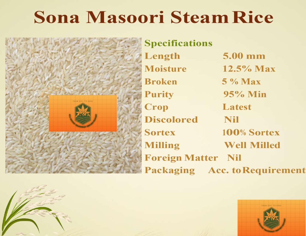 Sona Masoori Steam Rice is a high-quality, lightweight, and aromatic rice variety known for its excellent texture and cooking properties. With a grain length of 5.00 mm, 95% minimum purity, and 100% Sortex cleaning, it ensures uniformity and consistency. The well-milled grains, low moisture content (12.5% max), and minimal breakage (5% max) make it a preferred choice for wholesalers, retailers, and bulk buyers.