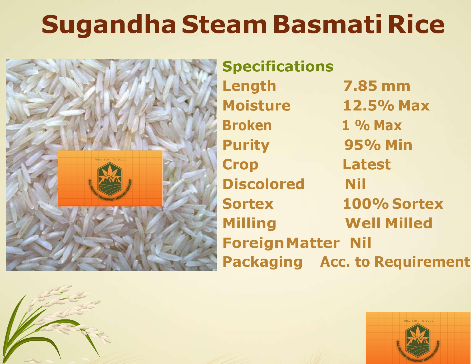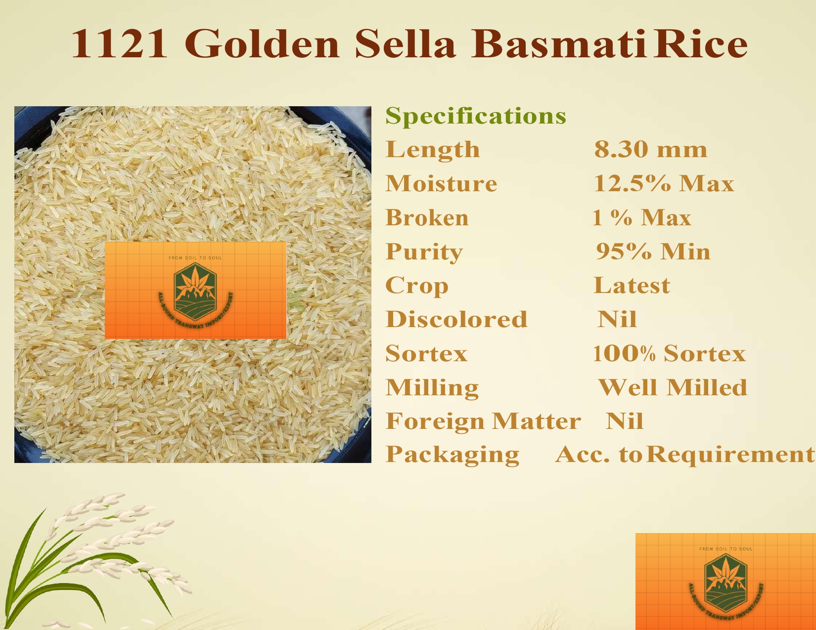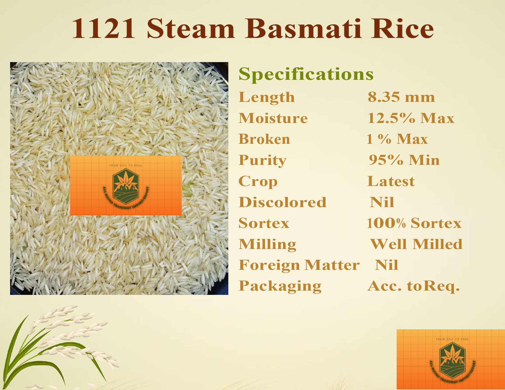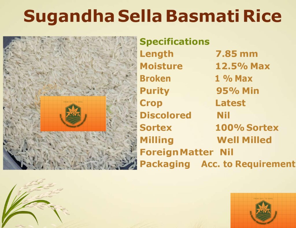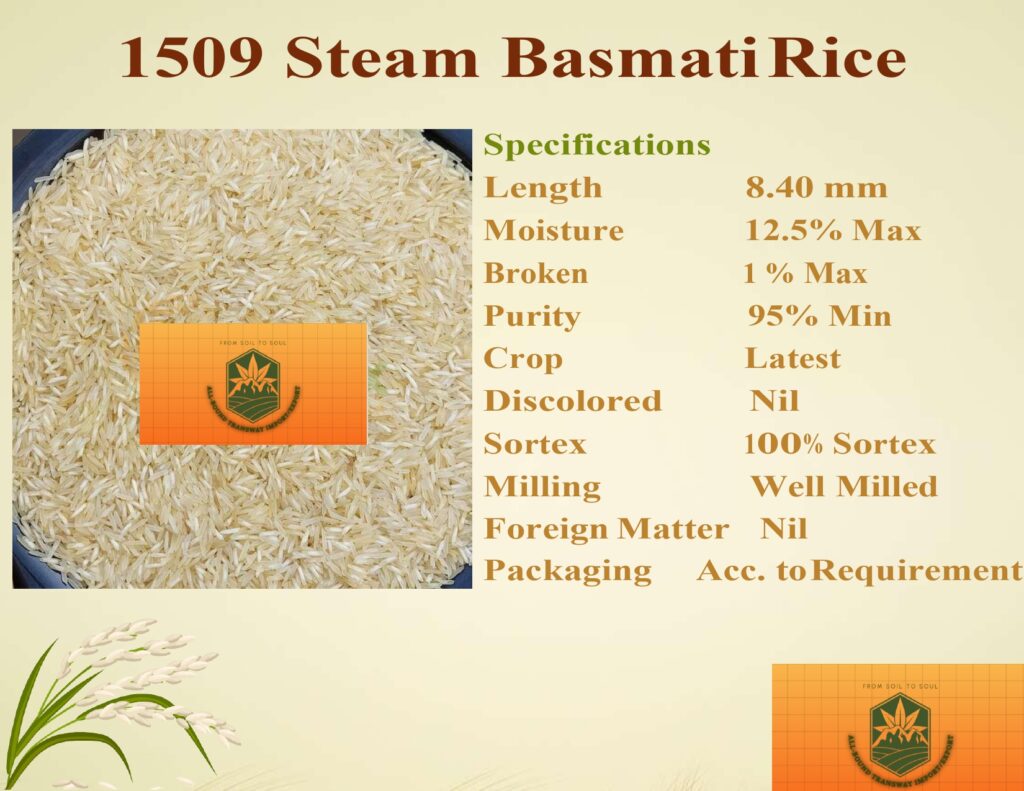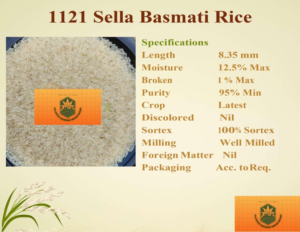 1121 Steam Basmati Rice is a top-grade, long-grain basmati variety known for its exceptional aroma, extra-long grains (8.35 mm), and soft texture. With 95% minimum purity, well-milled grains, and 100% Sortex processing, it guarantees superior quality. Low moisture (12.5% max) and minimal breakage (1% max) ensure freshness and durability, making it ideal for biryanis, pilafs, and premium dishes.