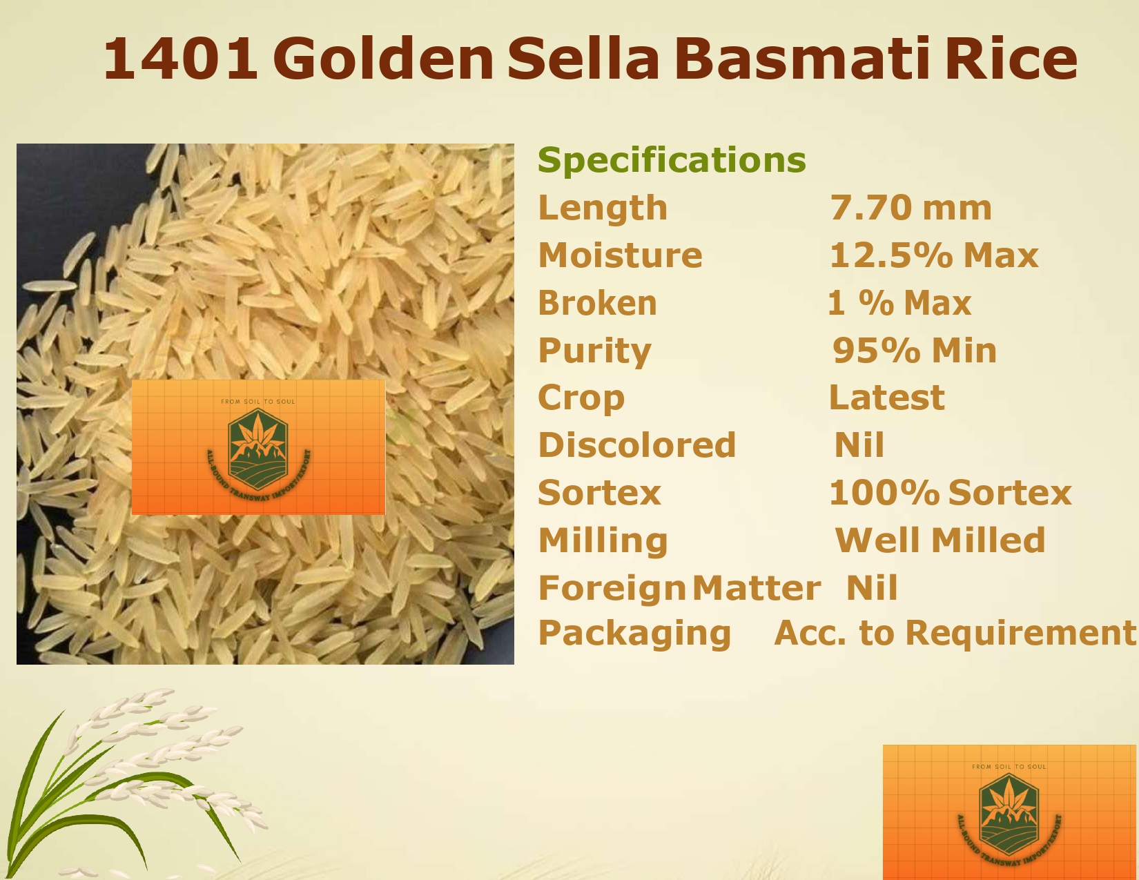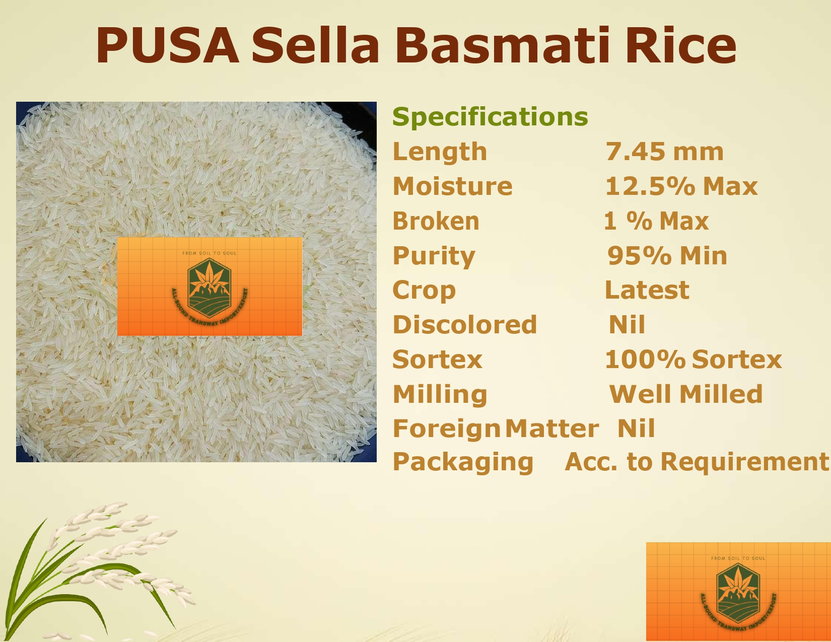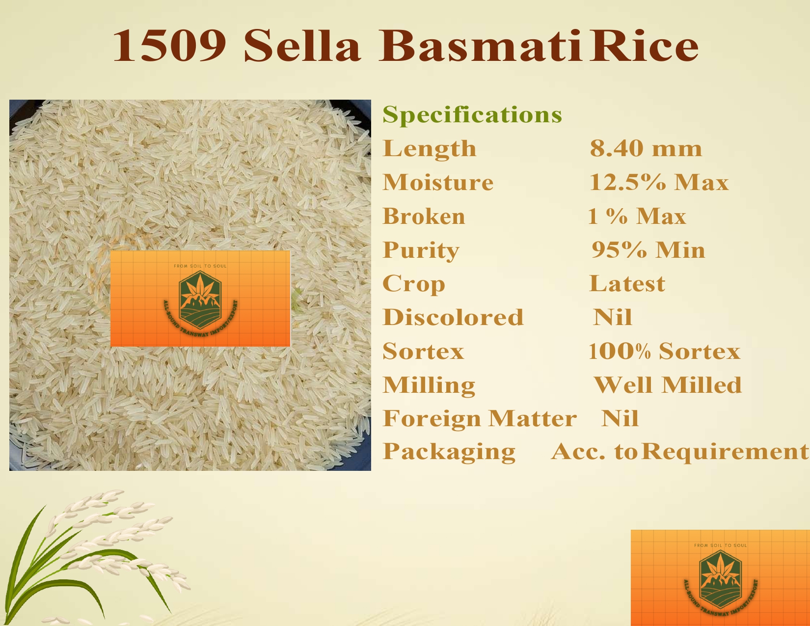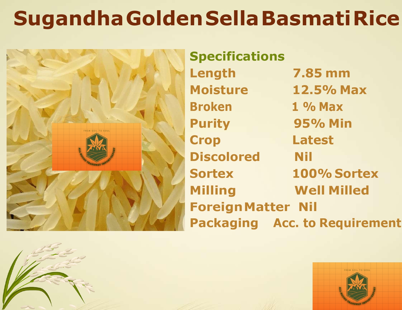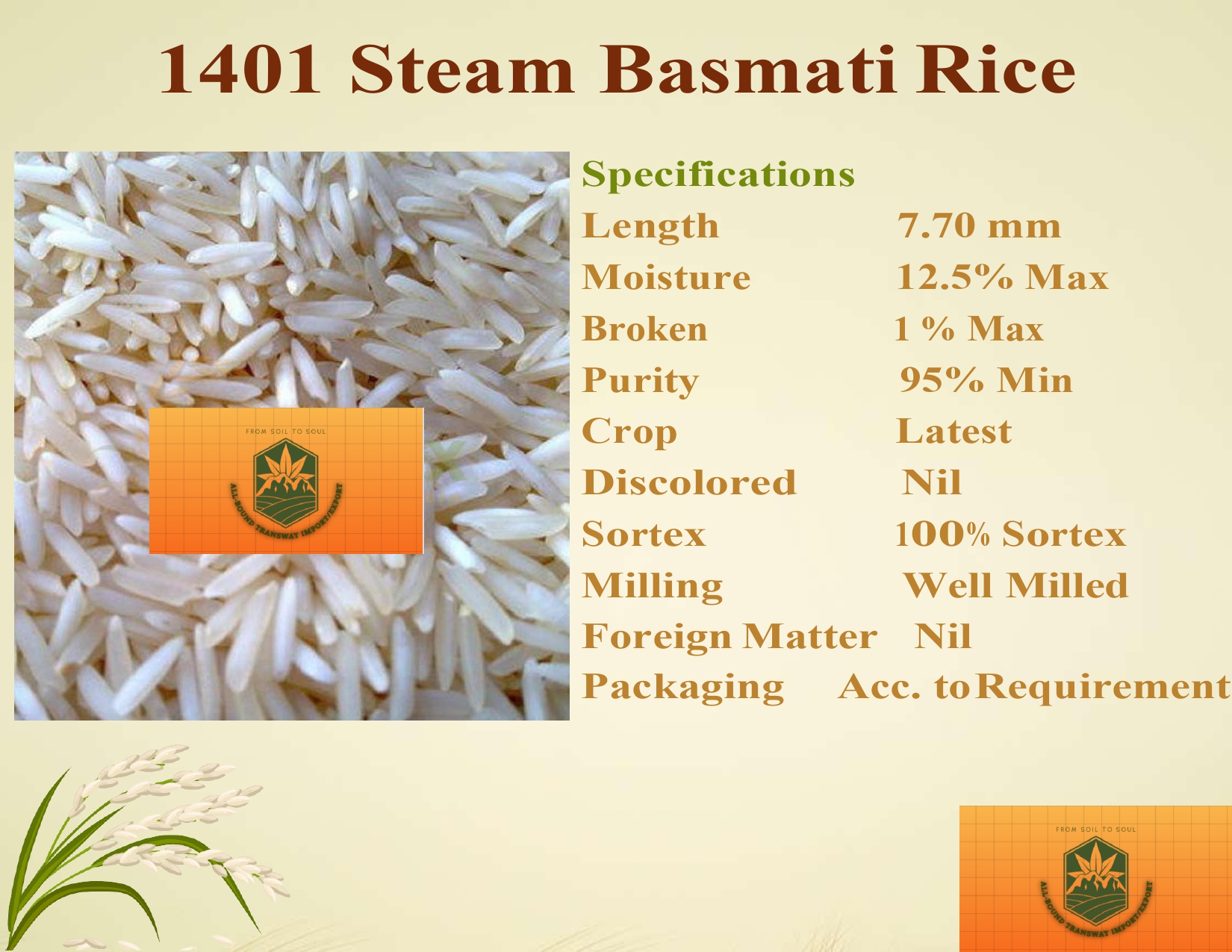 1121 Steam Basmati Rice is a top-grade, long-grain basmati variety known for its exceptional aroma, extra-long grains (8.35 mm), and soft texture. With 95% minimum purity, well-milled grains, and 100% Sortex processing, it guarantees superior quality. Low moisture (12.5% max) and minimal breakage (1% max) ensure freshness and durability, making it ideal for biryanis, pilafs, and premium dishes.